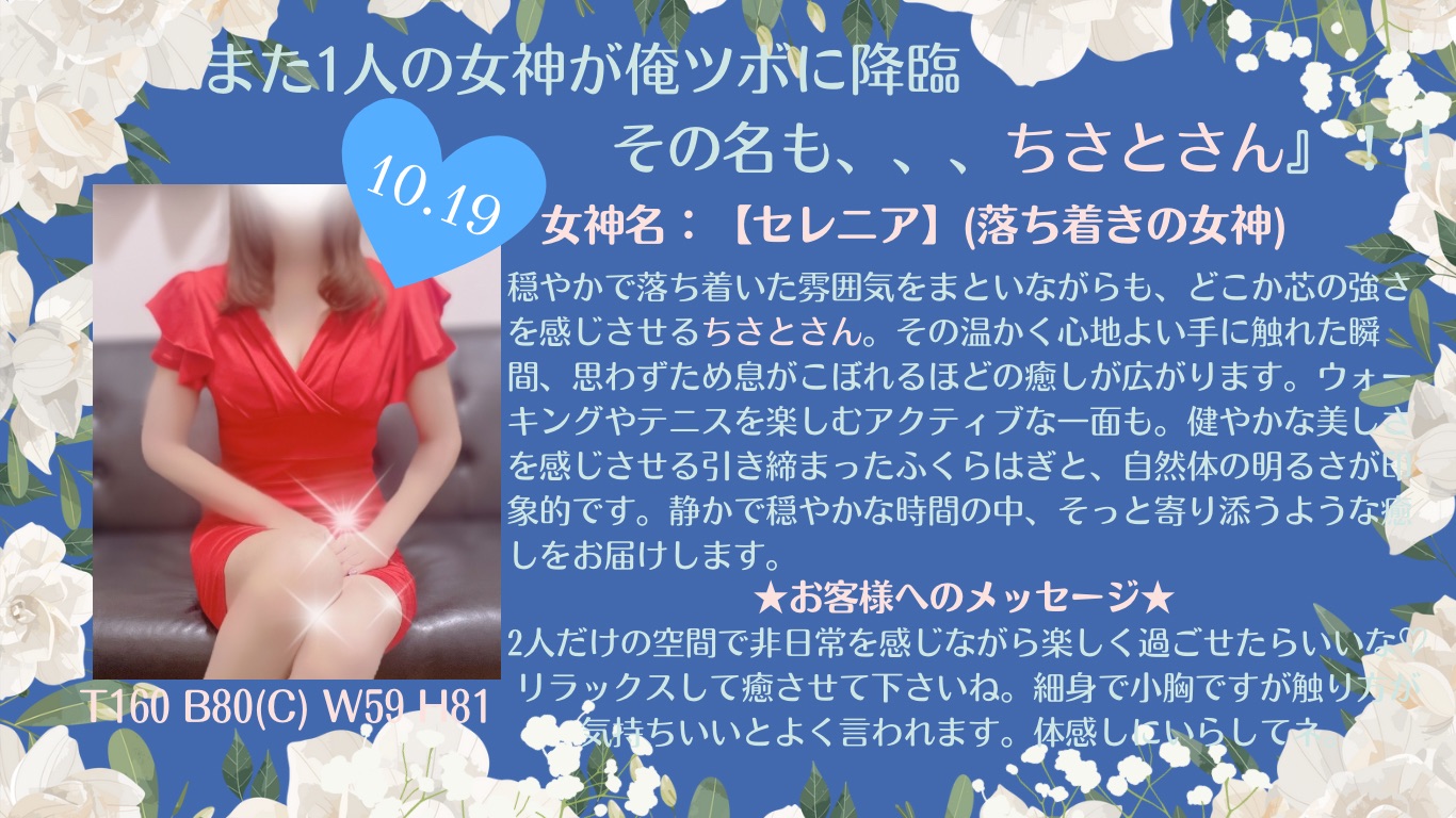 Tcm151 B85(C) W56 H84 はるかのXはこちらをタップ☚ ・女神名:ペルセポネ(花と春の女神) ・動物占い:感情的なライオン ・血液型:O型 ・マイブーム:アザラシをみること ・得意料理:とろけるカレー ・お客様へのメッセージ:癒やされたい♡キュンしたい♡の願いを花と春の女神はるかが叶えます♡楽しいひとときを一緒に♡笑顔のフルコンボだドン♫ お店から:小柄で可愛いらしい雰囲気とキュートな笑顔が魅力のはるかさん。お客様を喜ばせたいという思いで、一生懸命丁寧なマッサージを心掛けています。疲れた体も心も癒やされる時間をお届けします!