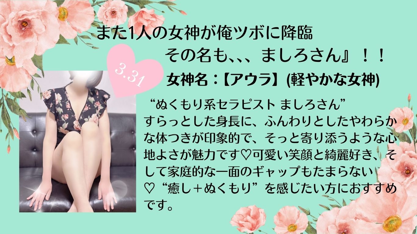 ・お店から:見た目は少しクールで、華やかな入れ墨が印象的な彼女。でも、一度お話しするとその内面の優しさと温かさに驚くことでしょう。彼女の手から伝わる癒しのエネルギーと笑顔で、心も体もリラックスさせてくれること間違いなし!!
